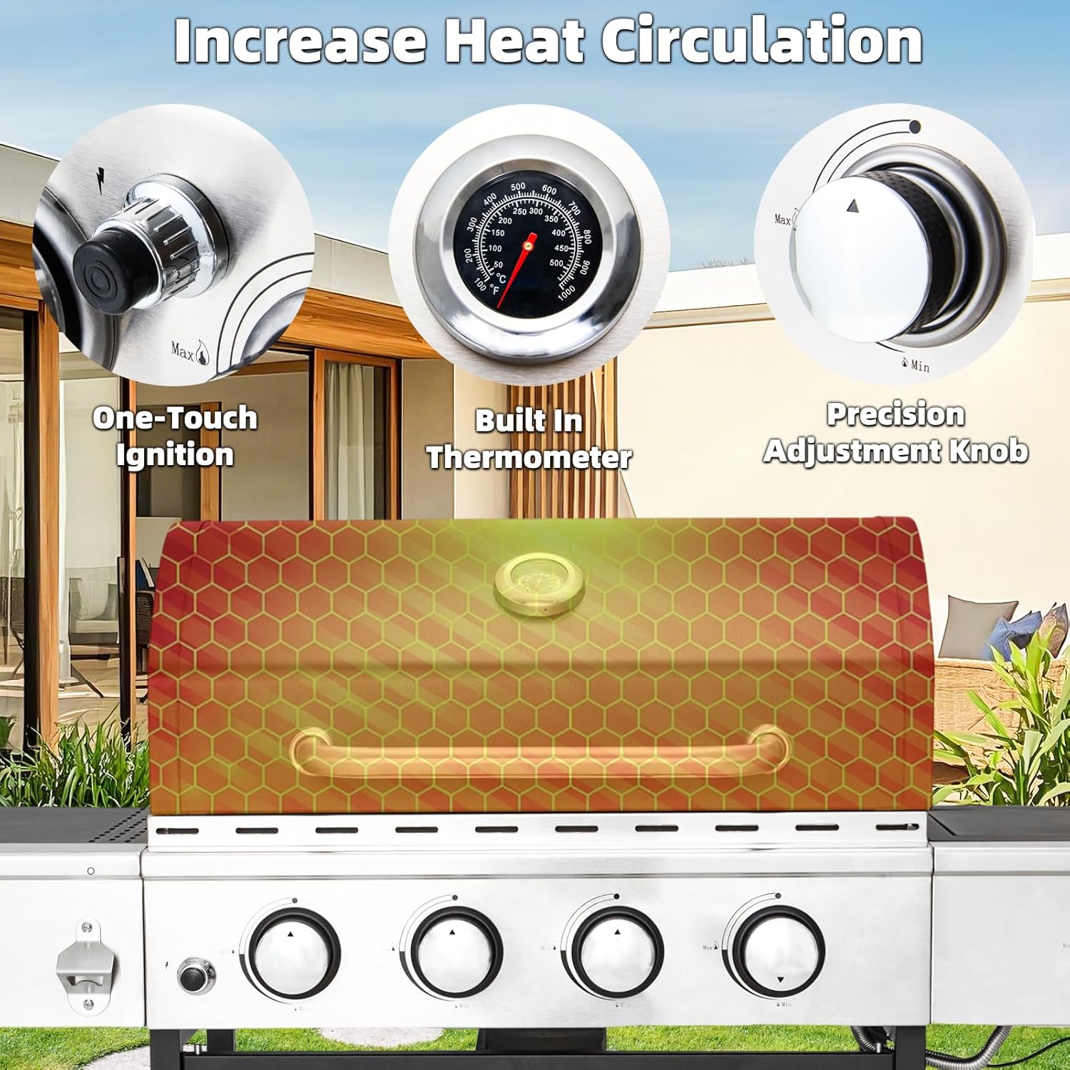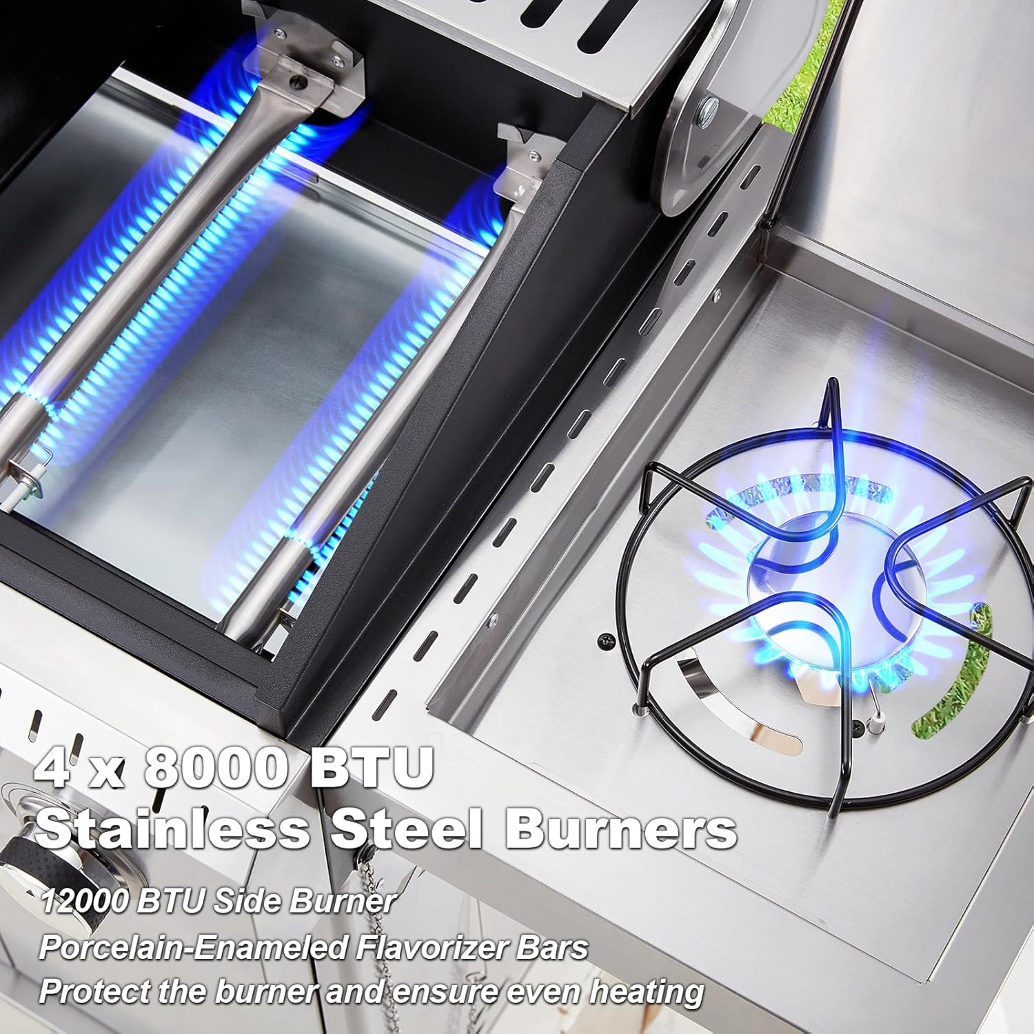 - Powerful Heating Performance - This propane grill features 4 stainless steel burners with 32.000 BTUs for even cooking and a 12.000 BTU side stove burner for sauces or boiling water. The piezoelectric ignition ensures easy startup. while the precision knobs allow for accurate flame control